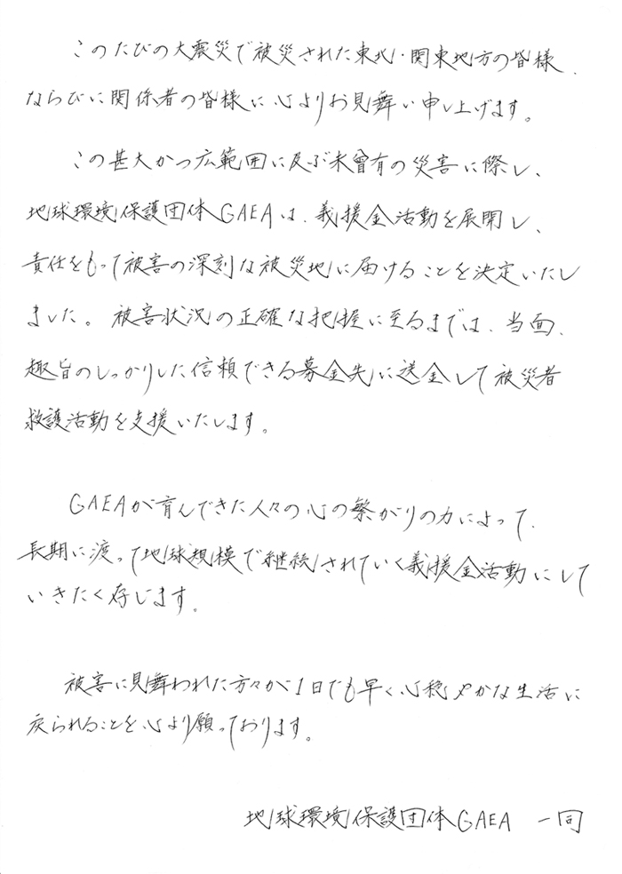 このたびの未曾有の大震災に際して、地球保護団体GAEAでは、義援金活動を大きなプロジェクトとして展開していくことを決めました。